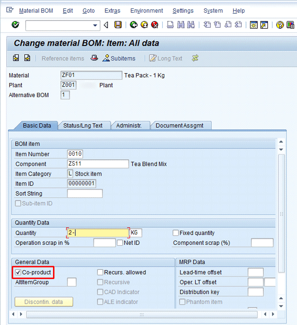 For a co-product, the relevant check in the BOM has to be activated. There is no such requirement for a by-product. The quantity is defined in negative terms for both co-products and by-products, for example, -2 units.