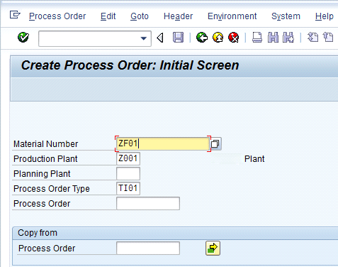 To create a process order, follow menu path Logistics > Production – Process > Process Order > Process Order > Create > Create with material or use transaction code COR1. Enter the material number, plant, and order type and press Enter (Figure 7). Figure 7 is the initial screen for the creation of a process order. Enter the Material Number ZF01, Production Plant Z001, and Process Order Type TI01. Press Enter, which leads to Figure 8.