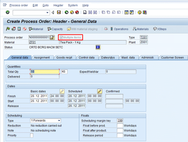 Figure 8 is the header data of a process order. Notice that in addition to the main product ZF01, a co-product ZS01 is also being produced. Therefore, the system automatically selects the Multiple items check box. Click the Materials button in Figure 8 to get to Figure 9.