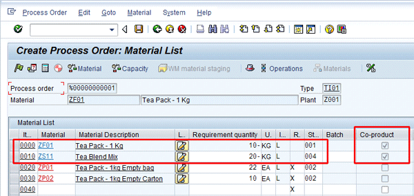 Figure 9 is the material list view of a process order. Here, the co-products are automatically reflected by the relevant check as well as by the fact that the quantity of both the product (main product = item 0000 and co-product) are shown in the negative. In a process order without a co-product, the main material is not shown in the material list. The positive quantity is the consumption quantities of materials in the process order.