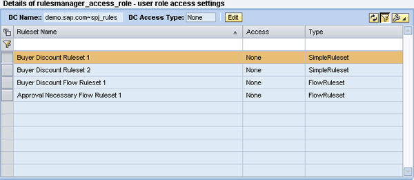 Let’s see how you can refine this even further. Look at the details section beneath the table of found role/DC pairs (Figure 11). It’s important to understand its contents in detail as it is the key for setting all the access rights for your rulesets. The line starting with DC Name: repeats the DC name chosen in the hit table (spj_rules). You can define the access rights for the DC individually. Currently, the DC Access Type is set to None. This is the reason why you could not open the DC in Rules Manager at the beginning of this article (compare with Figure 3).
