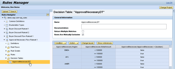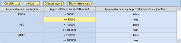 Say you want to change the threshold in the decision table for the Europe, Middle East, and Africa (EMEA) region to a lower value due to changed market conditions. Currently the value that decides whether an approval is necessary is set to 100,000 (Figure 2). Verify the correct behavior of your ruleset by using the Web Services Navigator (if you cannot remember how to test your rules with Web Service Navigator take a look at my first rules article, which explains the steps necessary to make your rules accessible via a Web service). If you enter a value greater than or equal to 100,000, the Web service should return true as value for the approvalNecessary return parameter. Otherwise, with the input 99,999 for the totalAmount field, the ruleset should return false (Figure 16).