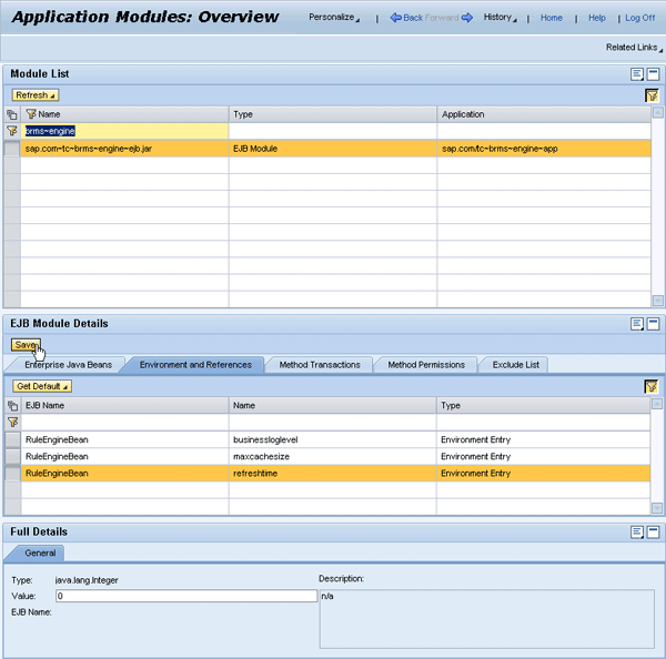Step 7. The Environment and References tab lists the parameters you can modify for the selected EJB. One entry is named refreshtime. Select it and in the Full Details section beneath you can change the time to 0, which results in an immediate activation. Once changed, click the Save button to store your changes. Verify the new behavior by changing and testing the decision table again.