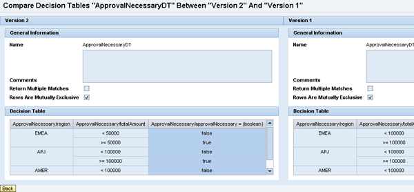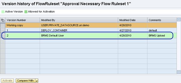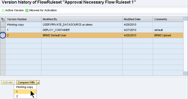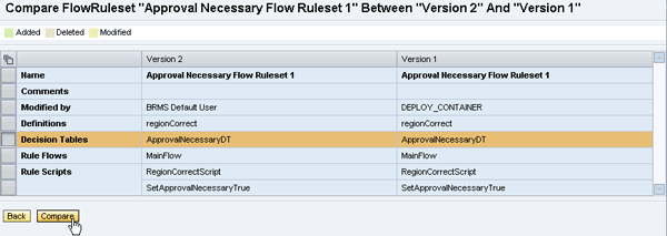 to the right of the Compare With button. As result, a drop-down list containing all versions of your ruleset appears. Select the version you want to compare with your selected version. In this example, I want to compare it with version 1. After you have chosen an entry from the drop-down list, the overview table in Figure 25 appears.