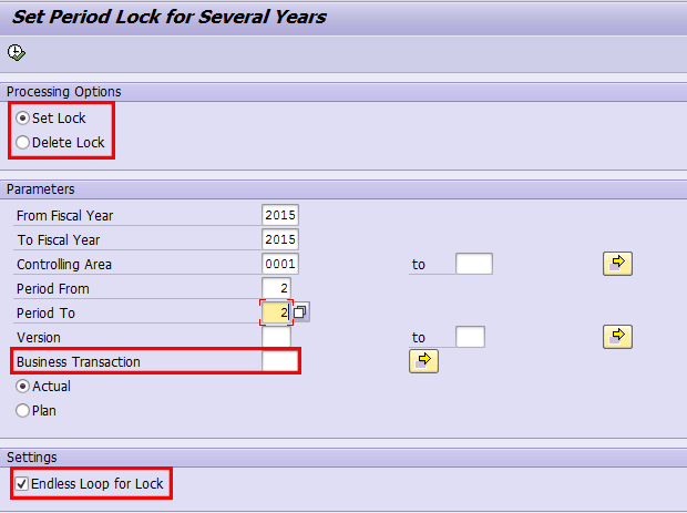 In the Processing Options section at the top of Figure 3 are two radio buttons that match the Lock and Unlock buttons in Figure 2. When you select the Set lock radio button, you lock the combinations of the selected periods and selected business transactions.