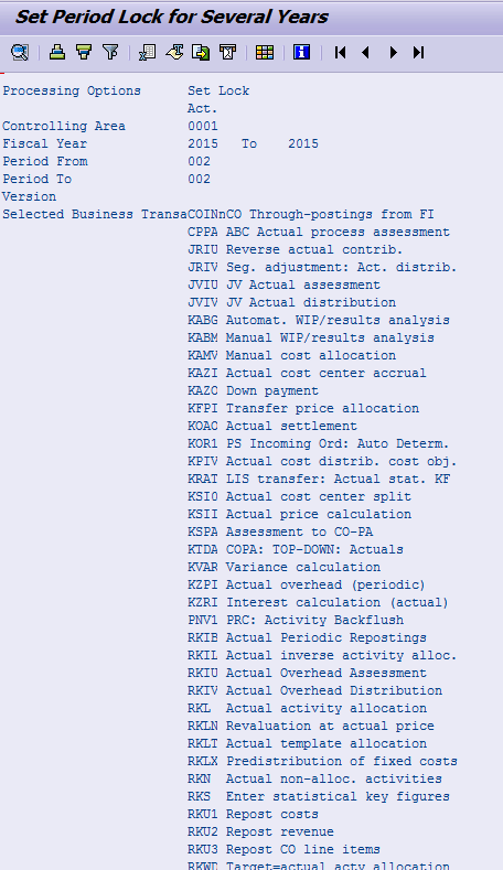 - Lock Transaction: locks a CO transaction for all periods (e.g., CO transaction Actual cost center split is closed for all periods using this button)