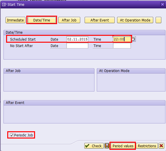 In the main screen click the Start condition button. In the pop-up screen that appears (Figure 9), click the Date/Time button to select a start date and time for the batch job. You can mark it as a periodic job by setting the relevant indicator. Click the Period values button to define the intervals you want for starting the job.