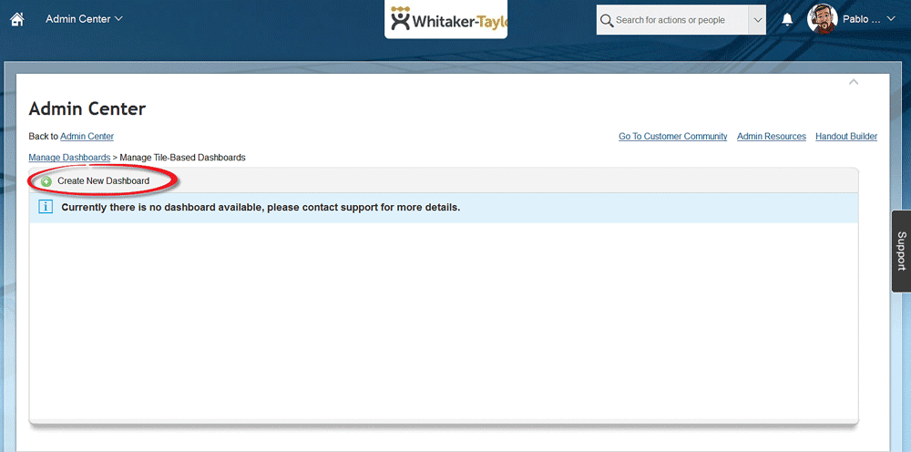 Now, look for the dashboard you just created. On the right side of the Admin Center screen in