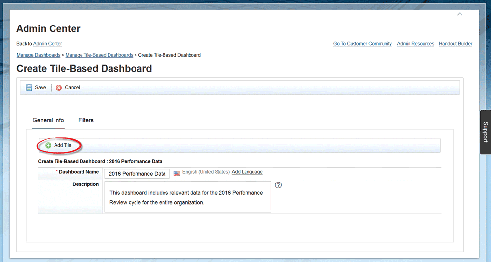 Figure 4), enter a name and a description for your new tile-based dashboard (e.g., 2016 Performance Data and This dashboard includes relevant data for the 2016 Performance Review cycle for the entire organization, respectively). Then click the Add Tile option.