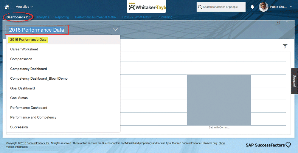 Figure 9), click Dashboards 2.0 at the top and select the dashboard from the drop-down menu options (in this case, 2016 Performance Data). This opens the dashboard you just created (