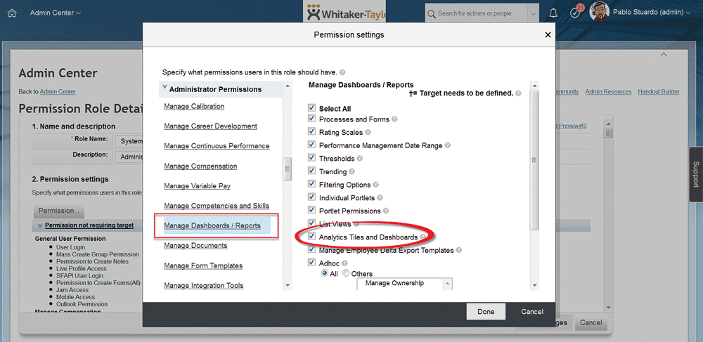 Figure 4, under Administrator Permissions, select Manage Dashboards/Reports. The screen on the right expands and shows the permission options. Select the Analytics Tiles and Dashboards check box and then click the Done button.