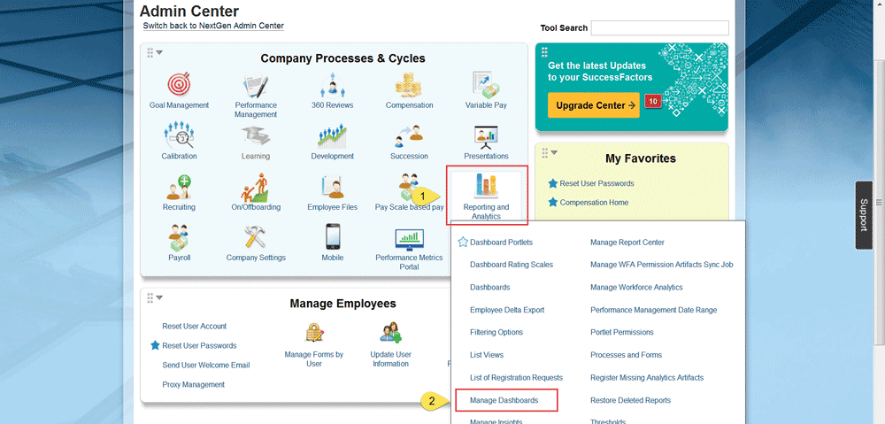 To enable Dashboards 2.0 Reports, if they are not already enabled, contact your SuccessFactors representative, customer support, or your SuccessFactors partner.