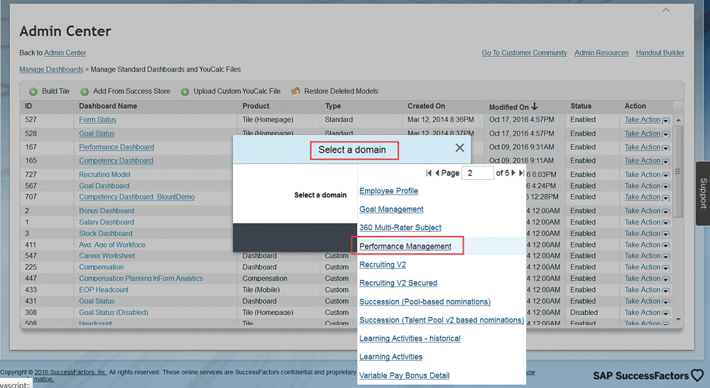 Go to the SuccessFactors Home page (Figure 1). Once there, click Home (on the upper left) and then select the Admin Center option from the drop-down options that open (not shown). (The Admin Center is the screen in which administrators can control and configure almost everything in the suite.) Selecting the Admin Center option opens the Admin Center (Figure 5). Click the Reporting and Analytics option and then select Manage Dashboards.