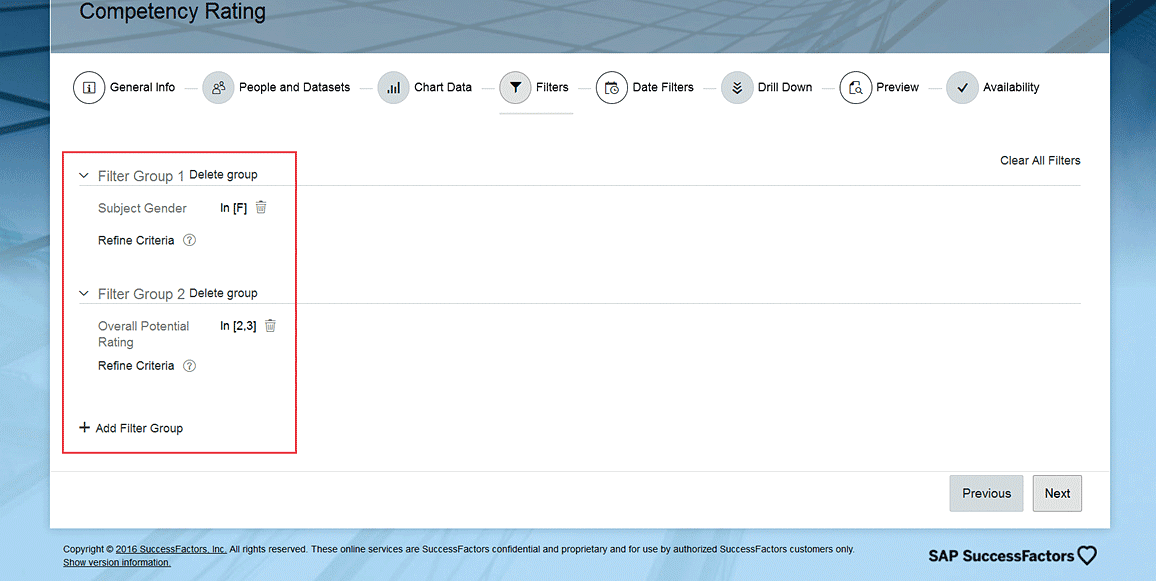 The next step is to create a filter using filter groups. A filter group is used, for example, if you want to see the overall competency score for only one region. In that case, a filter group can be created to do that. Here’s how.