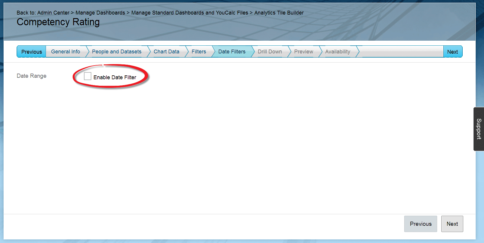 In this example, you do not add any date filters because you want to report on all the available data up to now (for the Performance Template you selected previously). So, leave the Enable Date Filter check box unchecked and click the Next button.