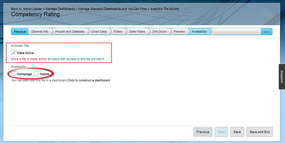In addition to making the tile active, you also can define whether you want to share the tile in the home page or in a mobile application. You do this by selecting the Homepage or Mobile check boxes. You can also select both options if you want. Make your selections and then click the Save and Exit button. This action opens a screen like the one in