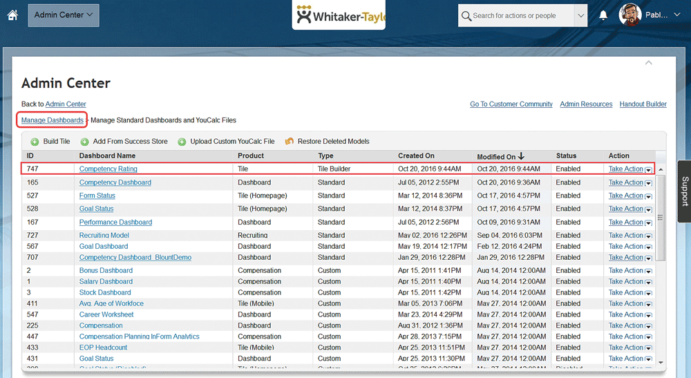 Select the Manage Dashboards option in the Admin Center