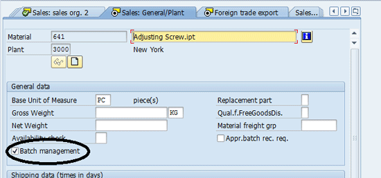 In the next screen (Figure 5) click the Sales: General/Plant tab. Select the Batch management check box and then click the save icon.Â