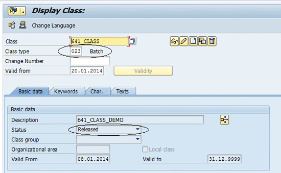 In the screen that appears (Figure 6), enter a name in the Class field (e.g., 641_CLASS), assign class type 023 (provided for the batch by SAP) to your custom class, and click the create icon. In the section below the Basic data tab, enter a date in the Valid From field and add a description of the class in the Description field. In the Status field select Released so that it can be used when it is ready.Â