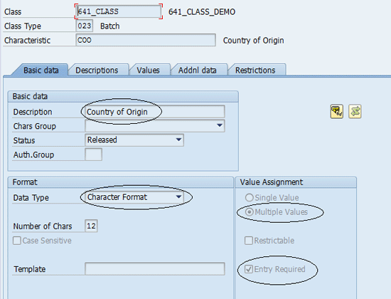 In the next screen (Figure 9), under the Basic data Tab, maintain the Description, Data Type of the characteristic, and the length (Number of Chars) of the characteristic. In the Value Assignment section, indicate whether the characteristic has single or multiple values and if an entry is required for the characteristic. In our example, for the COO, we have a multiple value assignment and it is mandatory to have a value for this characteristic. To configure these settings, go to the Value Assignment section in Figure 9 and select the Multiple Values and the Entry required check boxes. In the Status field make sure the status of the characteristic is Released so that it is ready for use.