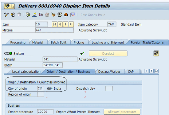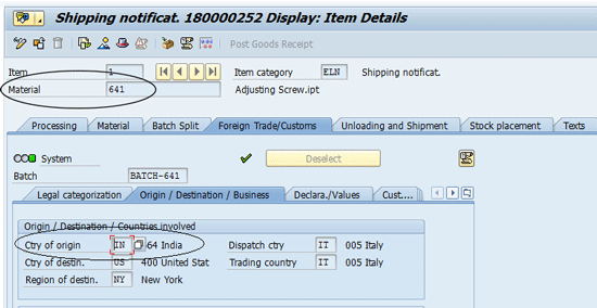 In the next screen (Figure 21) click the Foreign Trade/Customs tab and then click the Origin/Destination/Business tab. In the Ctry of origin field you can see the COO of the incoming material (e.g., 641) is 64 for India.