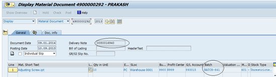 To access the material document information from the Stock Overview Screen of the material, execute transaction code MMBE. Â Select the batch used in the sales order BATCH- 641, right-click this item, and select the Material Movement from the drop-down list of options. (This screen is not shown.) To view the material document execute transaction code MB03. The data for the material document is visible in the screen that appears (Figure 18).