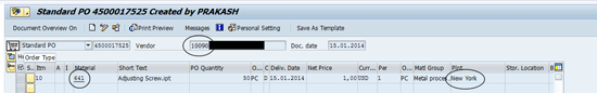 When you enter values in the Vendor and Plnt fields, the sytem populates the number and a named. For example, when we enter 3000 in the field in the Plnt column, New York appears.