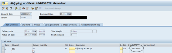 Now you need to create the inbound delivery document against the purchase order you created above. To do this execute transaction code VL31N. In the screen that appears click the Item Overview tab to view the batch number that is assigned to the material (Figure 20).Â