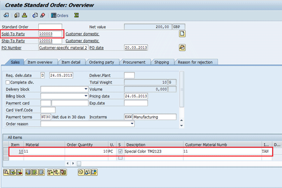 When a customer-specific material is entered in a sales order for a customer that is allowed to buy this material, then the status bar shows the message that the material entered is customer specific. Regular sales order processing follows, as shown in Figure 12.