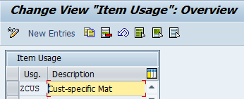 Step 2. Define item usage. By defining a new item usage (along with the new item category group defined in Step 1), you set up a specific determination rule of item category in the sales order. This new item usage is assigned in the customer-material information record to facilitate item category determination during sales order entry for the specific customer and material. Create a new item usage as shown in Figure 2. Follow IMG menu path Sales and Distribution > Sales > Sales Documents > Sales Document Item > Define Item Category Usage. Click the New Entries button to add a new item usage.