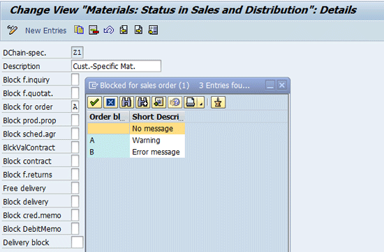 Enter A in the Block for order field as depicted in Figure 5. The new sales status is used for a text message appearing during sales order creation to notify users that a customer-specific material is entered. This is an optional step. If you do not want any additional message for customer-specific material entry in the sales order, then skip this step. If you skip it, then only the item category-related standard message error appears if the customer-specific material is entered in the sales order for a customer for which the sale of this material is not allowed.Â