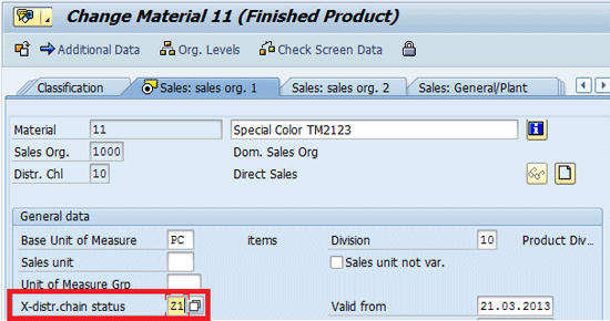 As shown in Figure 7, maintain the cross-distribution chain status as Z1 (new value configured in step 4 for customer-specific materials). Z1 is used in this process only for the text message that appears in the sales order to notify the users that a customer-specific material is entered.