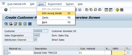 Step 6. Maintain the customer-material info record. Create a customer-material info record for the customer-specific material and assign the item usage field (with the value defined in step 2) in the customer-material info record. If the customer has provided a customer material number, then you can enter it in the Cust.material field or you can enter the material number in the Material no. field. Follow IMG menu path Logistics > Sales and Distribution > Master Data > Agreements > Customer Material Information > Create or use transaction VD51. Maintain the customer material info record for each customer-specific material as shown in Figure 8. Click Goto > Info record details. Maintain the item usage as ZCUS (new value configured in Step 3 for customer-specific materials) as shown in Figure 9.