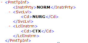 In the InstrPrty (instruction priority) tag, the possible values are either HIGH or NORM. In most cases, the NORM value is used. To maintain these values in the SAP system, execute transaction code DMEE and complete the DMEE tree mapping in the form of atoms used to populate one value versus the other.