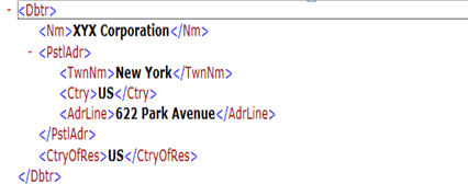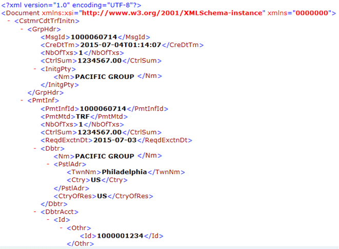 The InitgPty tag contains the information such as name of the initiating part (SAP company code name), customer ID (the customer identification number used by the bank and typically maintained in the SAP house bank customer number field), and a constant (BANK), if requested by the bank. The value BANK is maintained in the SAP DMEE (Data Medium Exchange Engine) tree itself and it can be included or excluded from the output file using conditions based on the bank Bank Identification Code (BIC) or SWIFT code. Figure 2 is an example of the XML code for the group header for pain.001.001.03.