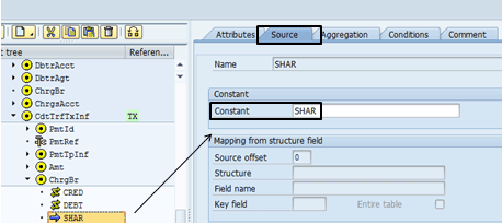 To change the charges indicator tag to be SHAR (shared) for all payments, go to the <ChrgBr> tag in the left panel of the DMEE (Figure 50).