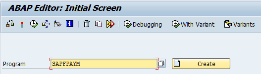 When you use the PMW, one program, SAPFPAYM_SCHEDULE, is used to create the payment media. The AP and Treasury and Risk Management payment programs trigger the program SAPFPAYM_SCHEDULE to run at the create payment medium step, which creates the payment media (payment file). After the configuration for the payment method has been done, the variants can be created. The variants to be used when SAPFPAYM_SCHEDULE is run are assigned in configuration. Before the variants can be assigned in configuration, the variants must first be defined. To complete this step, execute transaction code SE38, and in the screen that appears, enter the name SAPFPAYM in the Program field as shown in Figure 55. Note that you must create the variants on each system.