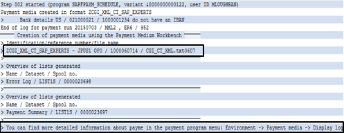 Figure 61 shows the payment log from our AP payment run. To access this log, click the Payment button (Figure 59). Note the references in the payment log indicating the payment medium format and XML file created.
