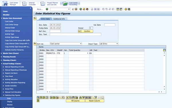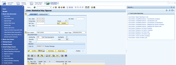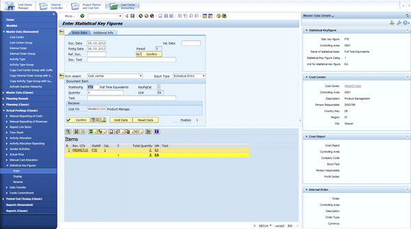 You see a shell area on the left that contains the menu structure, as well as generic functions, such as system connection and search. A canvas area on the right contains the screen for the transaction that the user is performing. In my example, I use the role Cost Center Accounting (selected at the top of the screen) and navigate through the menu structure on the left to transaction KB31N (Enter Statistical Key Figures). If you aren’t yet working with SAP NWBC, you can find instructions for installing and operating this client in SAP Note 1029940.
