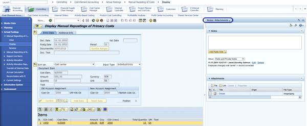 In addition to helping users to complete a reposting, side panels can also be used to record why the posting was necessary. Figure 12 shows additional documentation associated with a correction posting (transaction KB13N). In this example, I include a note explaining why the reposting was necessary and upload an attachment that documents the rationale behind the reposting decision. This information is attached to the document number and, if it is a public note, is available to anybody else who displays that document. Therefore, this process is a good way to document any extraordinary posting. Keep in mind that this document is stored with reference to the document number of the posting document, so anybody who views this document via SAP NWBC can potentially see the public note.