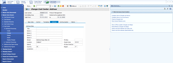 Besides the ERP-based CHIPs, I recommend that you also consider the use of Web services to access external information from within your FI and CO transactions. These services are useful in FI to allow you to display, for example, an address look-up for your customer on Google Maps or a Google Search for the name of your customer. They are also a great way to create mash-ups that mix the old — in the form of the customer master data transactions — and the new — in the form of the Web services that most users are familiar with from their everyday Web browsing activities. To provide you with a taste of where you can take this kind of mash-up, take a look at the address data in transaction KS02 (change cost center). To access the list of available Web services, click the triangle to the right of Notes/Attachments (Figure 12) and choose Web Services, then choose the Web Services (Cost Center) CHIP in the side panel (Figure 13).