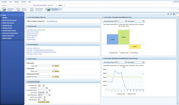 Once the home page is part of your role, your main job is to introduce your end users to the main functions. To make sure that they don’t see empty reports, make sure to introduce them to the My Default Settings part of the screen (as shown in Figure 2) and explain how to enter the cost centers, activity types, and statistical key figures for which they are responsible, because these are passed to the CHIPs as starting parameters. Once the users update these settings, they can collapse the tray by clicking the small arrow to the left of the title bar.
