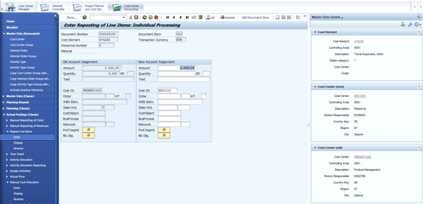 Figure 6 shows the side panel for the reposting transactions and the master data CHIP. The master data CHIP shows the cost element details and cost center details for both the old and the new cost center. This feature works because the relevant fields in transaction KB61 are tagged so that the keys of the cost element and the two cost centers can be passed as selection parameters from the row view of the transaction to the side panel. This tagging allows the system to access the relevant information from the master data. As you work through the list of the line items to be reposted, the contents of the side panel change.