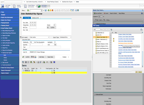 The same master data panels are offered in the context of many transactions. Figure 7 shows the same master data CHIP being used for transaction KB31N (the statistical key figure posting). Again, note that the key for the cost center is passed to the CHIP along with the key for the statistical key figure (e.g., full-time equivalent [FTE]). You also see empty CHIPs because the screen variant I use includes cost centers and statistical key figures only. If I were to shift to a different screen variant, then the cost center CHIP might be empty, but the order master data would receive parameters. Again, you probably want to remove account assignments that your organization does not use from the side panel.