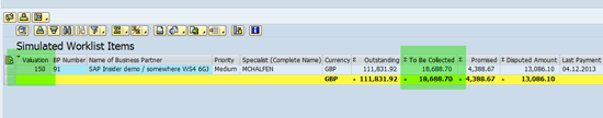 Figure 5 shows the simulated worklist item after the Strategy simulation. (The simulation process within the collection strategy allows you to confirm how a customer [business partner] will act based on the rules defined in the collections strategy. When you are designing a collection strategy, the simulation button is used to compare how different customers react to the rules and scoring within the collection strategy.) The two columns highlighted in green show the valuation the customer would achieve and show the value of the amount to be collected.