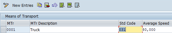 Step 7. Configure a means of transport in EWM. In customizing for SCM Basis, follow menu path Master Data > Transportation Lane > Maintain Means of Transport. In the screen that displays (Figure 18), click the New Entries button. Enter a code in the field under the MTr (means of transport) column and describe the means of transport in the field under the Description column. Enter a code in the field under the Std Code (standard code) and a speed in the field under the Average Speed columns. (The average speed is measured in kilometers per hour.) This data helps you to determine the distance between the locations to be travelled. Click the save icon.