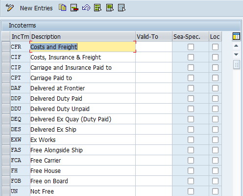In the screen that appears (Figure 20), click the New Entries button. Populate the first two columns of the refreshed screen as shown in Figure 20. In the Loc (location) column, select the check boxes for any incoterms that are mandatory. Click the save icon.