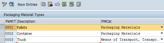 Step 6. Check the packaging material type in EWM. In customizing for Extended Warehouse Management, follow menu path Cross-Process Settings Handling Units > Basics > Define Packaging Material Types. In the initial screen, click the New Entries button (Figure 17). As part of the handling unit setup, you need to define a packaging material in the field under the PkMtT column, describe the material in the field under the Description column, and enter the name of a category in the field under the PMCat (packaging material category) column. Click the save icon.