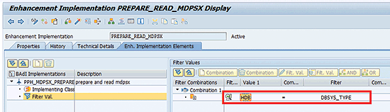 In Figure 1, double-click Implementations (on the left), and the screen shown in Figure 2 displays. If you select the option Filter Val. (filter values), you see that the value HDB was set to filter DBSYS_TYPE. This value corresponds to the SAP HANA database. It is the default value for this implementation delivered by SAP on the standard system.