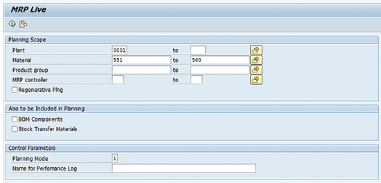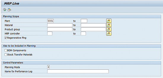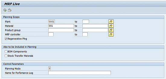 Now I plan the same material with similar planning parameters on MRP Live. In order to do this, execute transaction code MD01N. As shown in Figure 3, in the Planning Scope section of the screen, populate the Plant and Material fields, and select the Regenerative Plng (regenerative planning) check box. In the Control Parameters section, enter a value in the Planning Mode field (e.g., 3) and click the execute icon to start the MRP run.